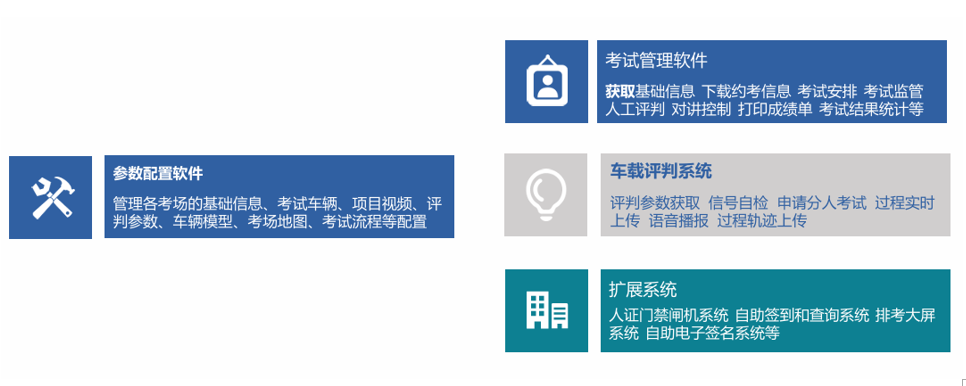 系统全新架构设计,完全符合《机动驾驶申领和使用规定(中华人民共和国公安部第162号令)》标准的建设要求,系统主要由考试参数配置软件、考试管理软件、车载评判系统组成,系统参数配置和业务办理系统分开管理,进一步提高系统的安全性、可维护性。